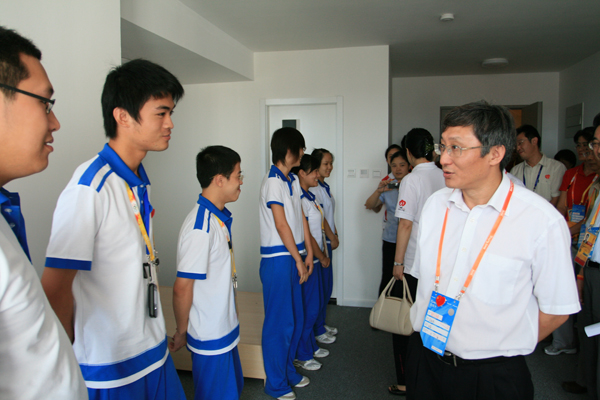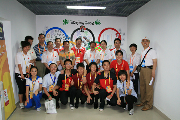 校領導一行先后來到C4樓前臺、C3公寓樓工作間等處,看望了志愿服務的同學們。吳建偉書記對同學們的工作熱情與工作狀態表示了充分的肯定,他希望同學們抓住難得的鍛煉機會,為中國人爭光,為中醫學子爭光。吳書記多次叮囑同學們注意健康,在長時間、高強度的工作期間,注意調節身體狀態,保證以健康的體魄和熱情的態度為奧運做好服務。喬旺忠副書記、魏天卯副校長、谷曉紅副書記、徐孝副校長也分別表達了對同學們的問候。領導們向同學們贈送了奧運微笑圈,鼓勵大家再接再厲,用微笑服務北京奧運。領導們還特地來到地下室,看望了庫房志愿者。志愿者們艱苦的工作環境和辛勤的工作場景,讓領導們頗為感動,他們與志愿者同學親切握手交談并合影留念。