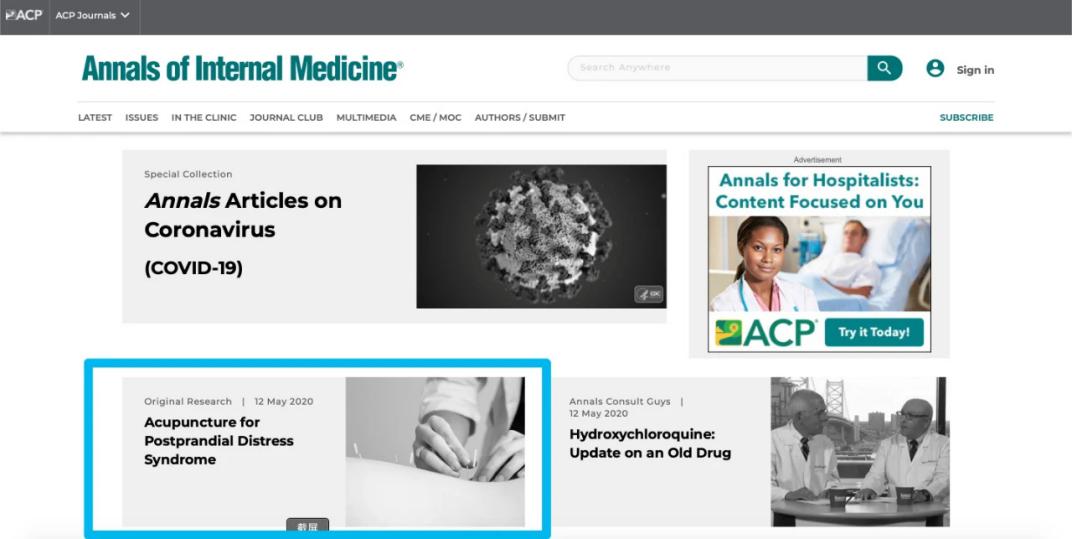 《內科學年鑒》創刊于1927年,是美國內科醫師協會的官方雜志,主要報道內科相關的臨床與基礎研究結果、專家評論、醫師執業準則、公共衛生政策等。美國內科醫師協會成立于1915年,是世界上最大的醫療專業協會,2018年該雜志影響因子為19.315,被稱為國際內科學領域“第一刊”,中國大陸學者發文比例僅占總發文量的1.09%。該研究歷時三年,通過嚴謹的頂層設計和完善的質量控制保證研究的真實性,最終發表在具有國際影響力的頂級期刊上,不僅為中醫針灸治療餐后不適綜合征的有效性提供了科學依據,同時也標志著我國針灸臨床研究質量和水平越來越獲得國際廣泛認可,對推動針灸的現代化和國際化具有積極作用,是中醫針灸走向世界的又一標志。