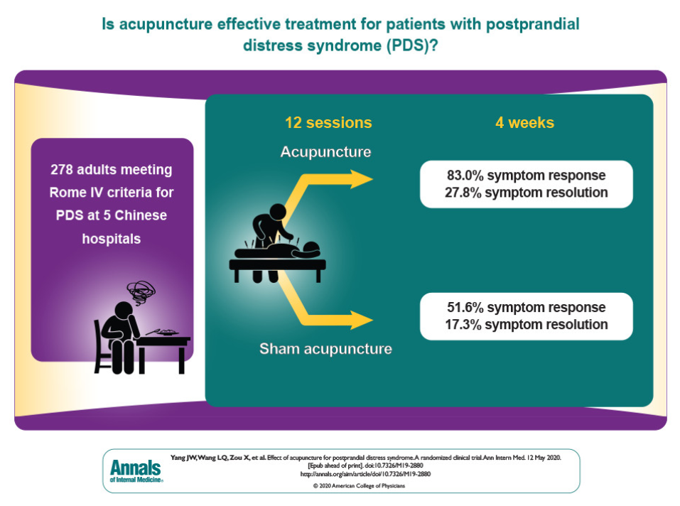 臨床研究由北京中醫藥大學牽頭,北京中醫藥大學東方醫院、首都醫科大學附屬北京中醫醫院、首都醫科大學附屬北京友誼醫院、北京中醫藥大學東直門醫院、北京中醫藥大學附屬護國寺中醫醫院、中國中醫科學院國內6家醫院和科研院所共同完成。研究以餐后不適綜合征患者為研究對象,278例患者被隨機分配并接受為期4周的針刺或假針刺治療。結果表明,每周3次的針刺治療可明顯改善餐后不適綜合征癥狀,提高患者生活質量。停止治療后,療效可維持12周,治療期間不良反應較少。此項臨床試驗用高質量的證據證實了針灸治療餐后不適綜合征的臨床療效。