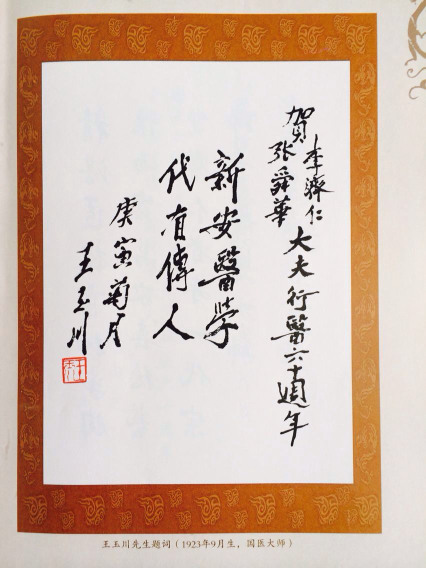 可能是因為王玉川老先生的思想太過超前,許多人都不能理解他的心境,高處不勝寒的他在別人看來是不近人情的。但張其成教授和他的父親卻十分清楚,這位獻身于學術的大師,骨子里是最重情義,也是極為真誠的。旁人若是拜托王老題字,或是要求采訪,王老都會一概回絕,可當李濟仁教授請王老題詞時,王老則是責無旁貸、熱情相贈。在采訪時,張教授還熱情地向我們展示了王老贈予的題詞,我想,這份濃厚的師生情誼對于張教授來說也是彌足珍貴。