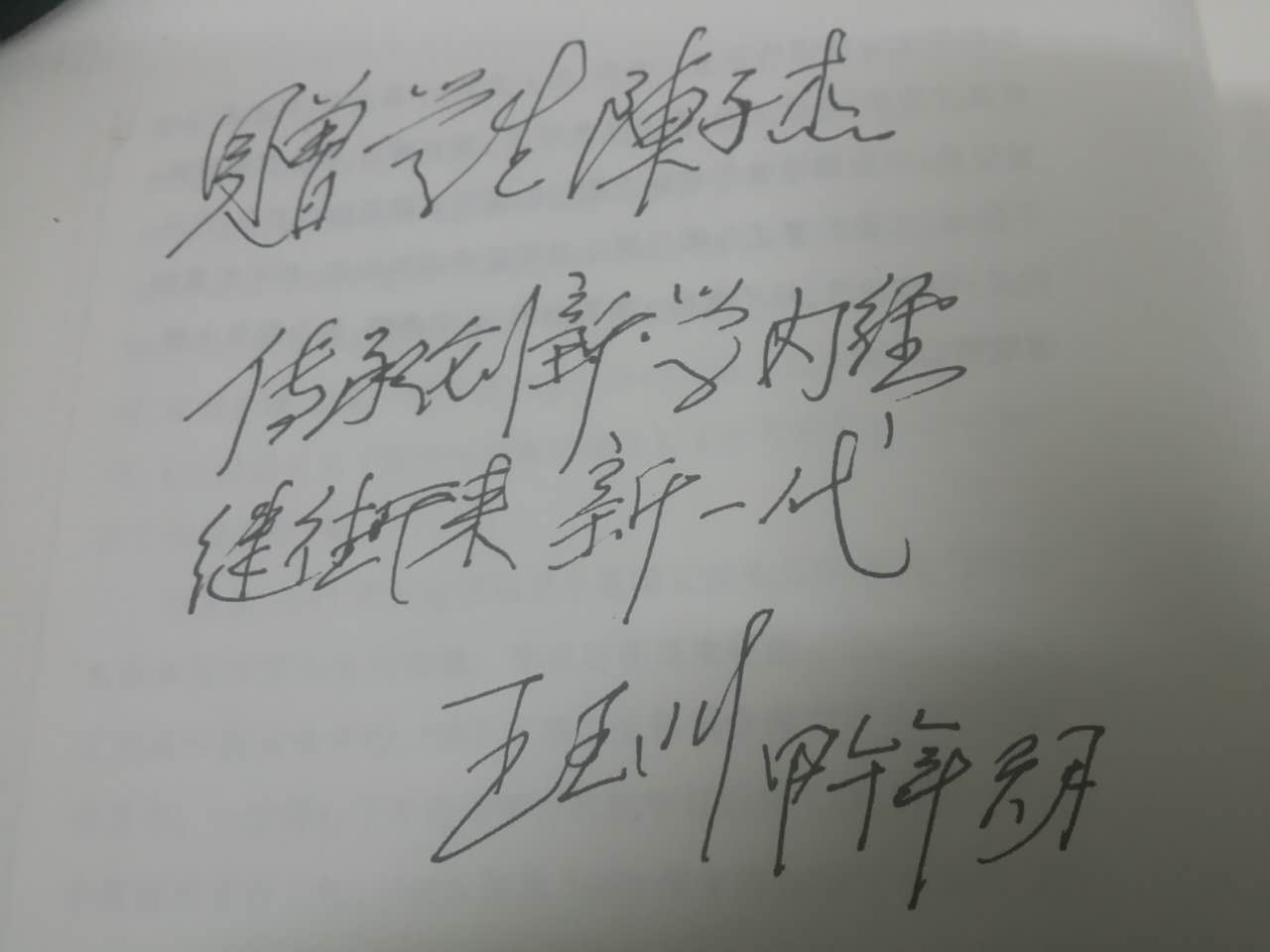 這些年,在郭霞珍老師的帶領下,也開始跟王老有了面對面的交流,可以親身聆聽大師之教誨。初見大師,身為晚輩的我誠惶誠恐,王老卻是平易近人,和藹可親,對學生無絲毫生分,雖年近九旬,卻是樂觀豁達,言語神情中透露著對我們后學的無限鼓勵與期望。2014年,王老著作《王玉川古方求學筆記》出版,郭霞珍老師帶我去給王老家中送書,王老甚是高興,并取書題詞“傳承創新學內經,繼往開來新一代”贈與學生,當王老顫顫巍巍把書交在我手里時,學生受寵若驚,深感肩上責任之重大。